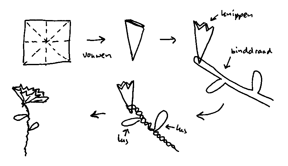 bloem erin vast komt te zitten; spaar eventueel lussen binddraad