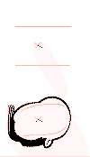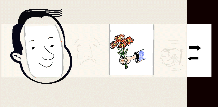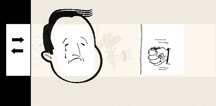 verdrietig gezicht, en rechts, waar de strook boven het papier komt,